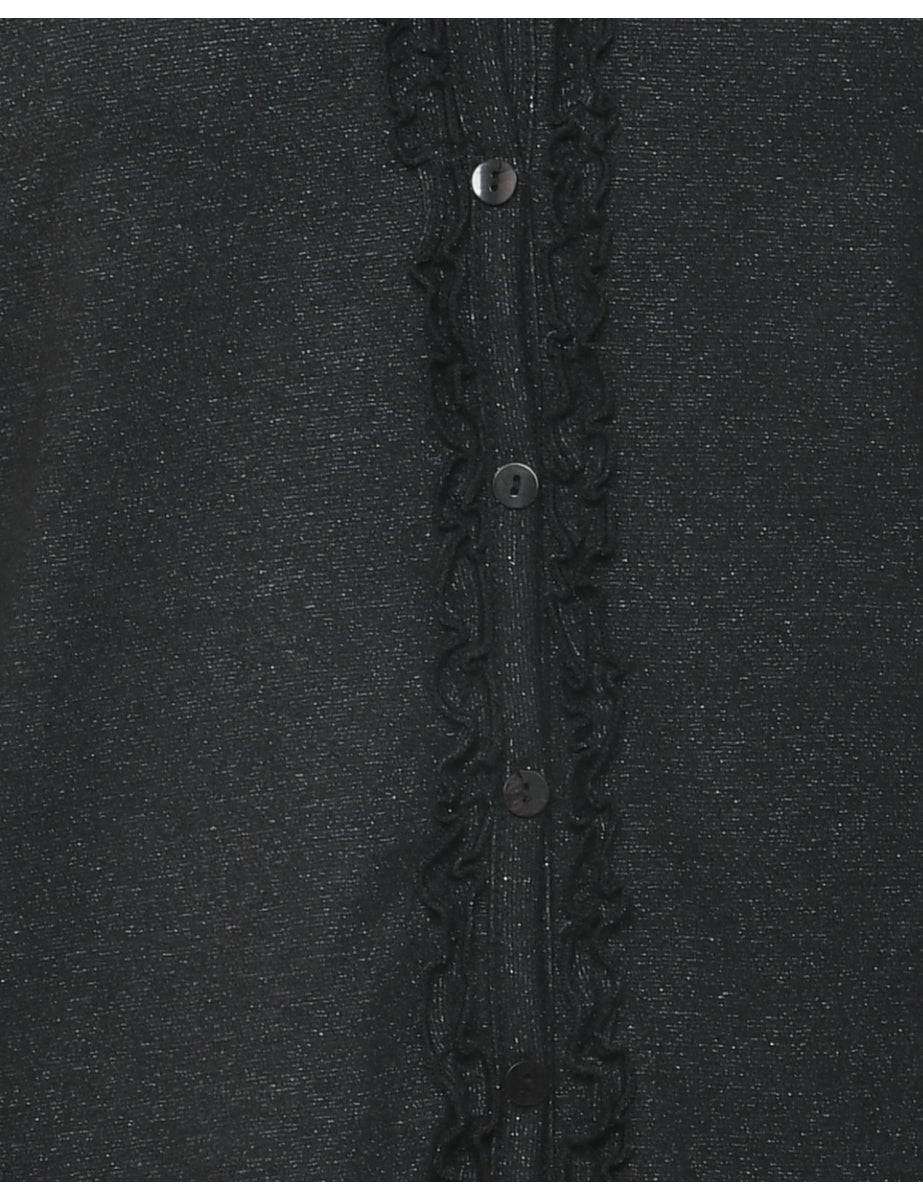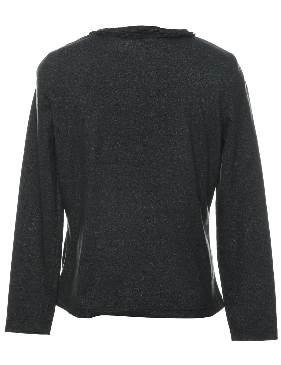 Button front evening blouse in black with a v-neck and decorative trim.