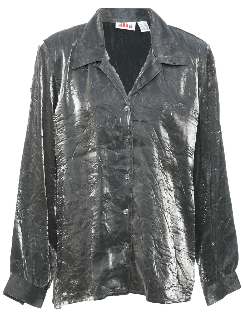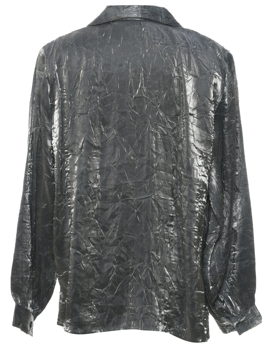Long sleeved evening blouse in dark grey with a revere front and removable shoulder pads.