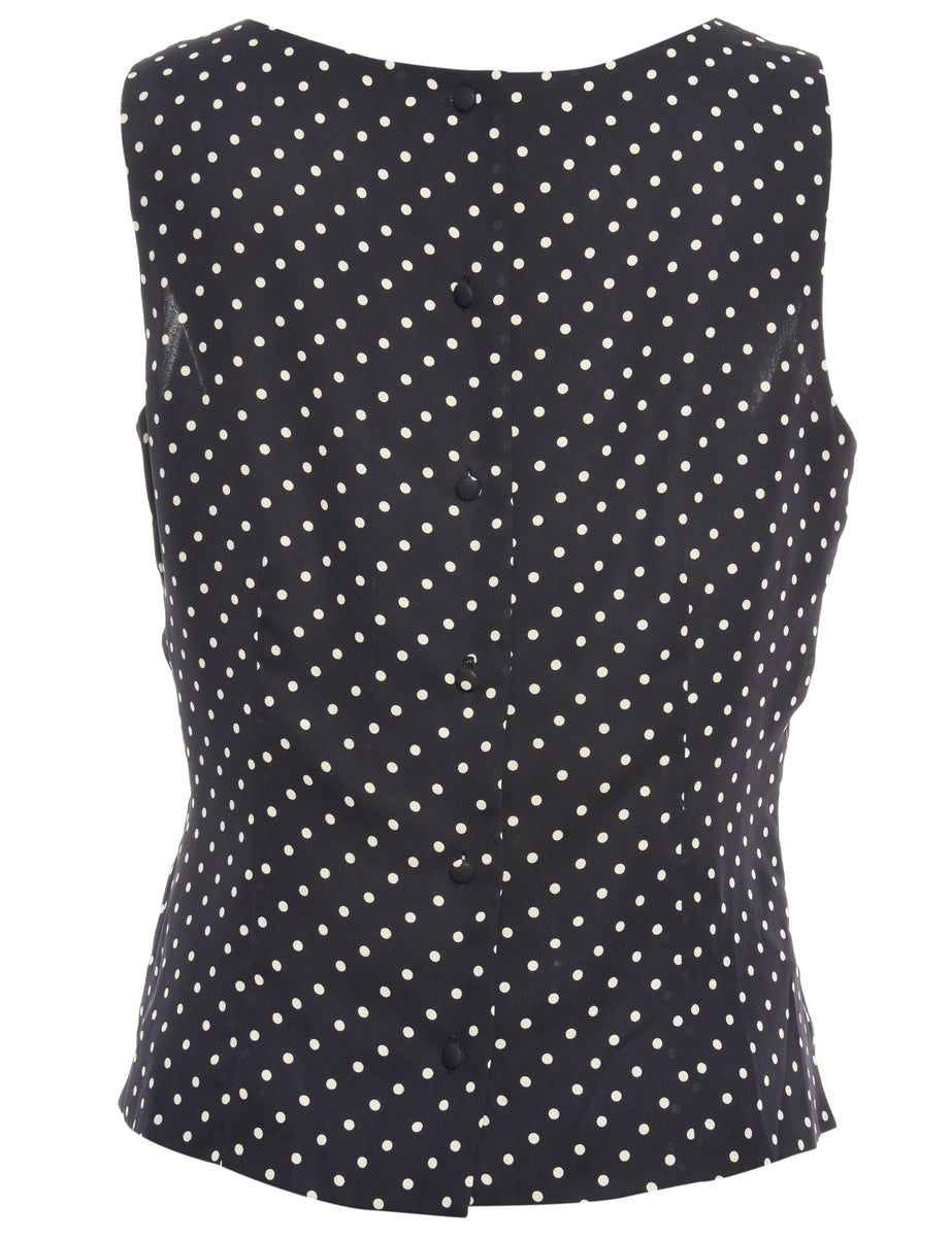 Button-front navy & white polka dot print sleeveless top complete with full lining.