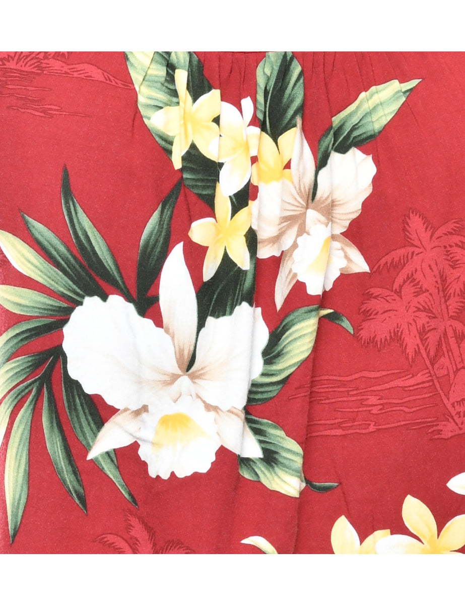 Floral vest comes in red with front pleats.