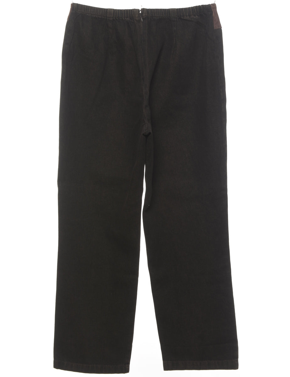 Tapered denim trousers. Comes in dark brown with contrasting trim.