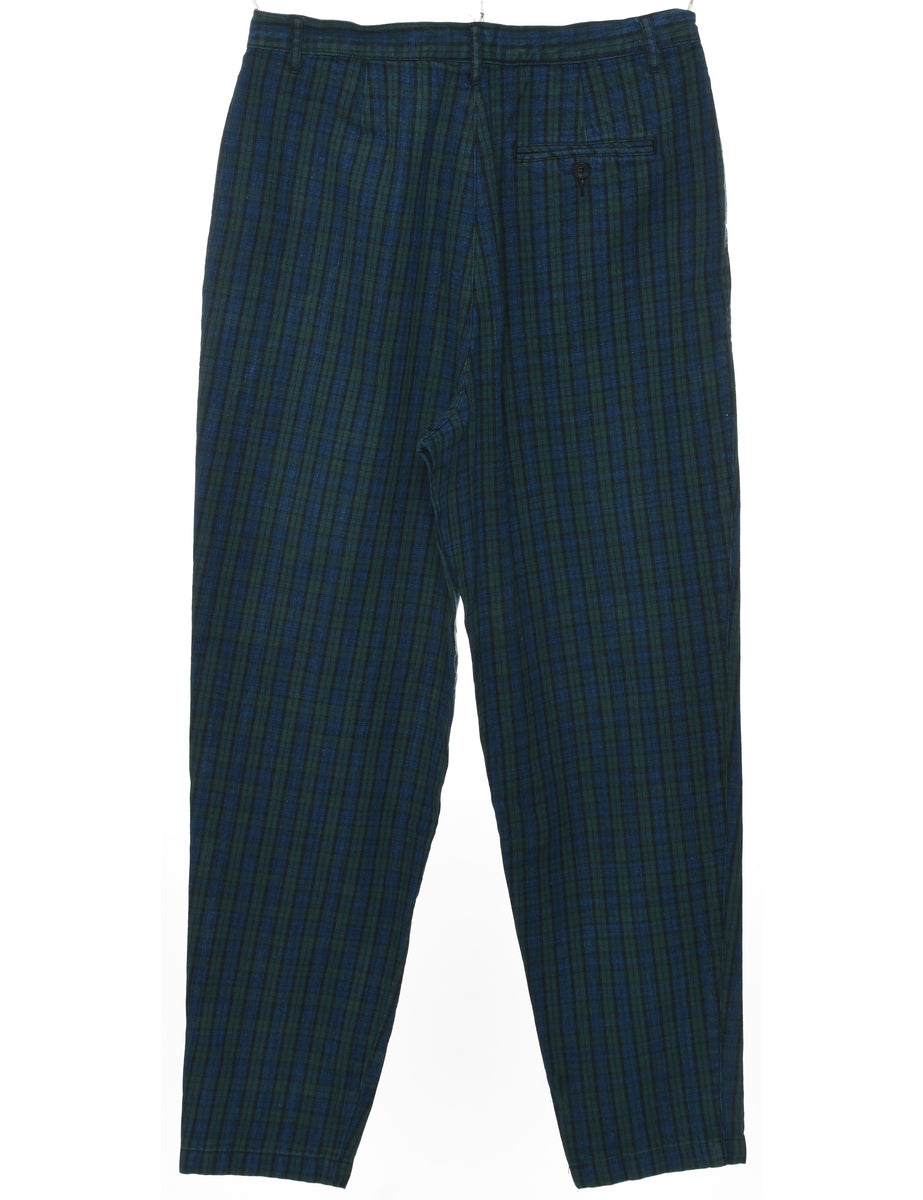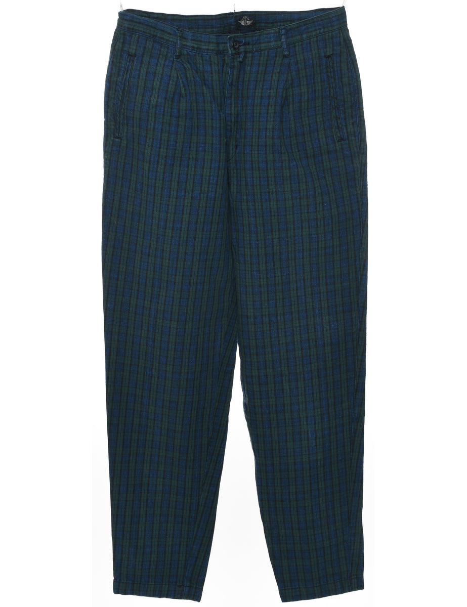Checked trousers with tapered fit. Comes in navy & green with belt loops and multiple pockets.