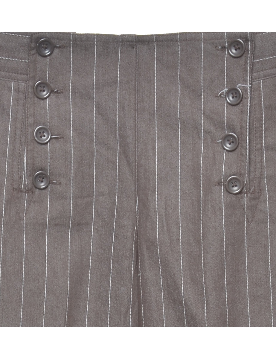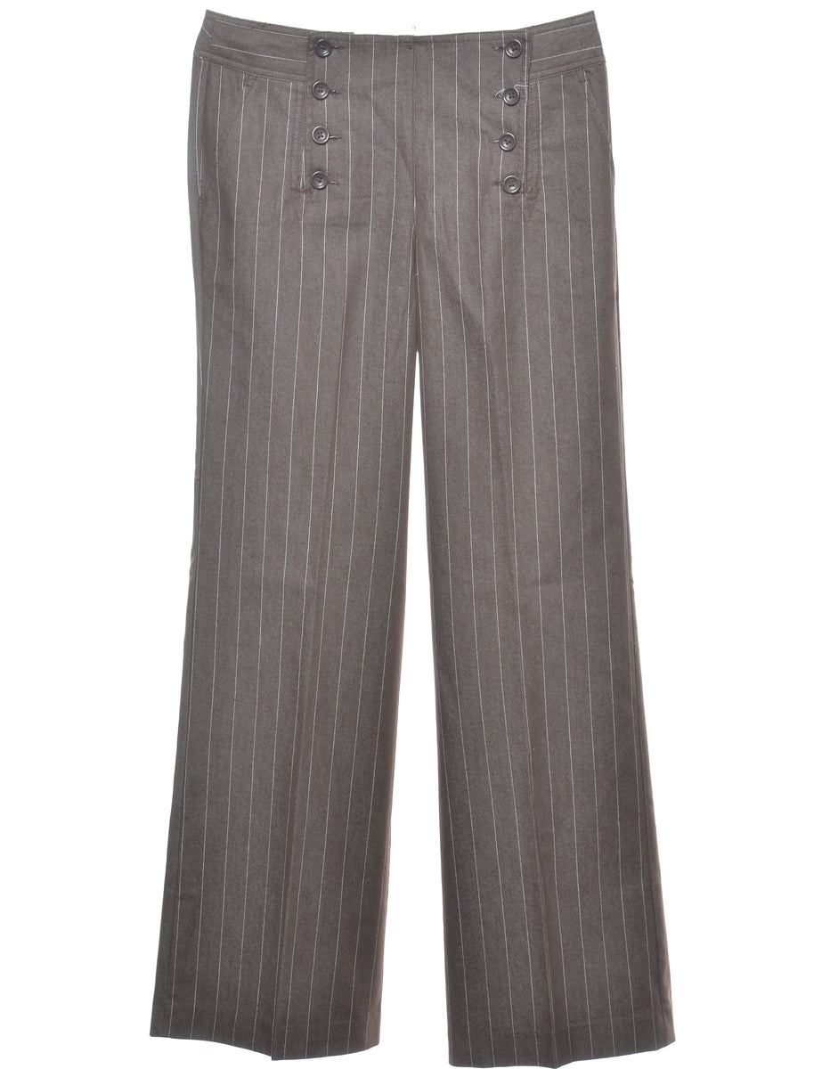 Flared leg trousers with pinstripes. Comes in dark brown with pockets.