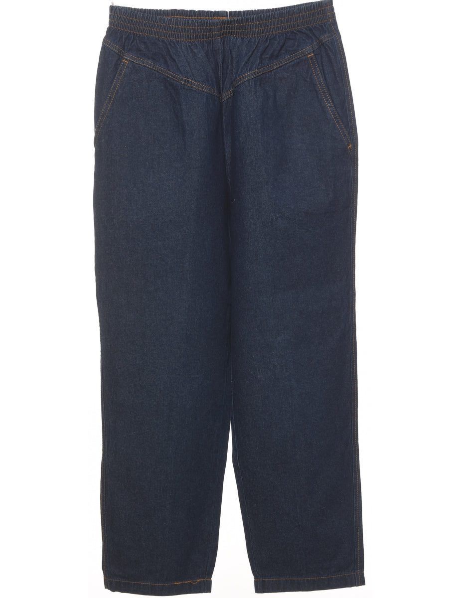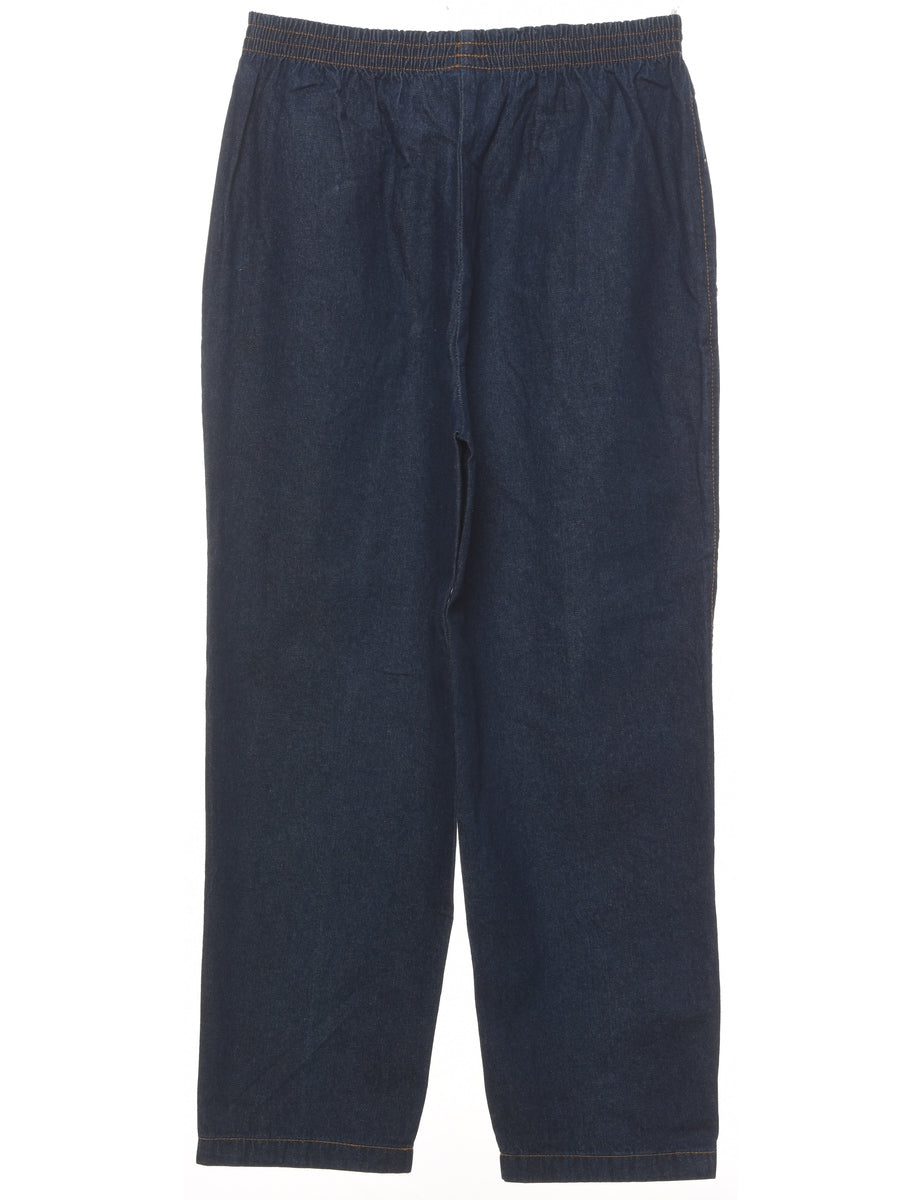 Tapered indigo denim trousers with an elasticized waist and a high waist.
