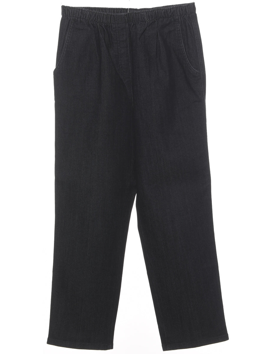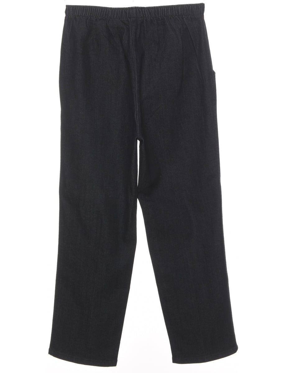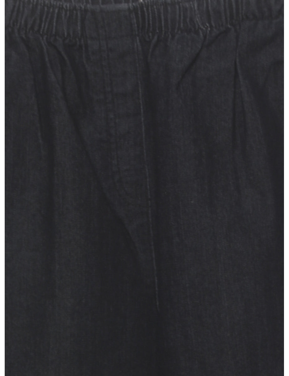Tapered denim trousers comes in black with multiple pockets and an elasticized waist.