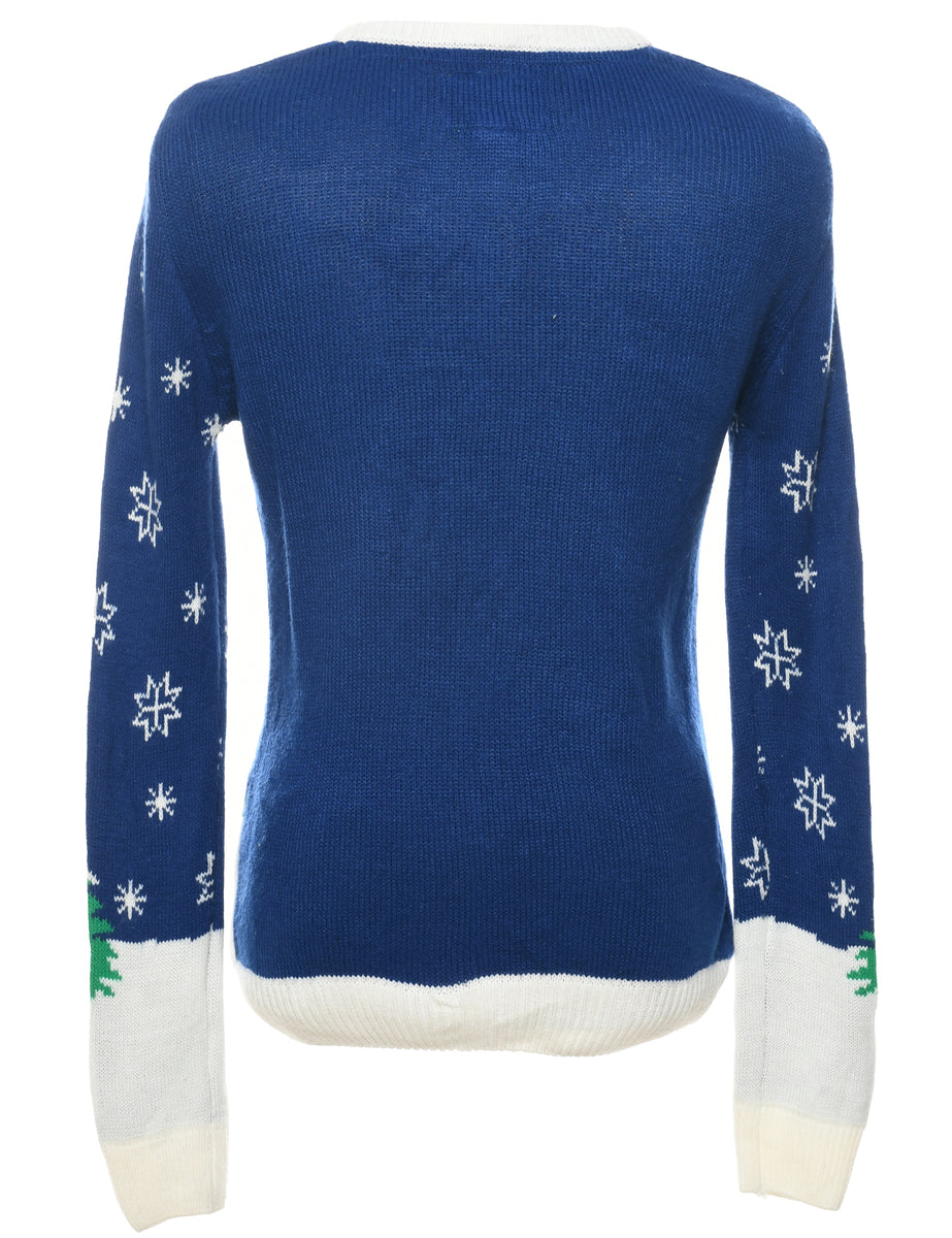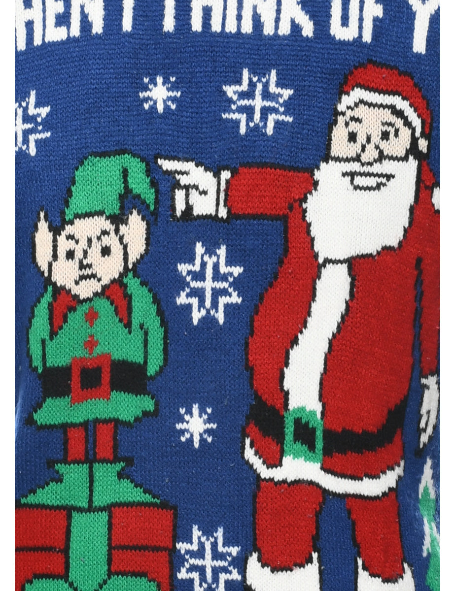 Santa claus christmas jumper in blue with a round neck.