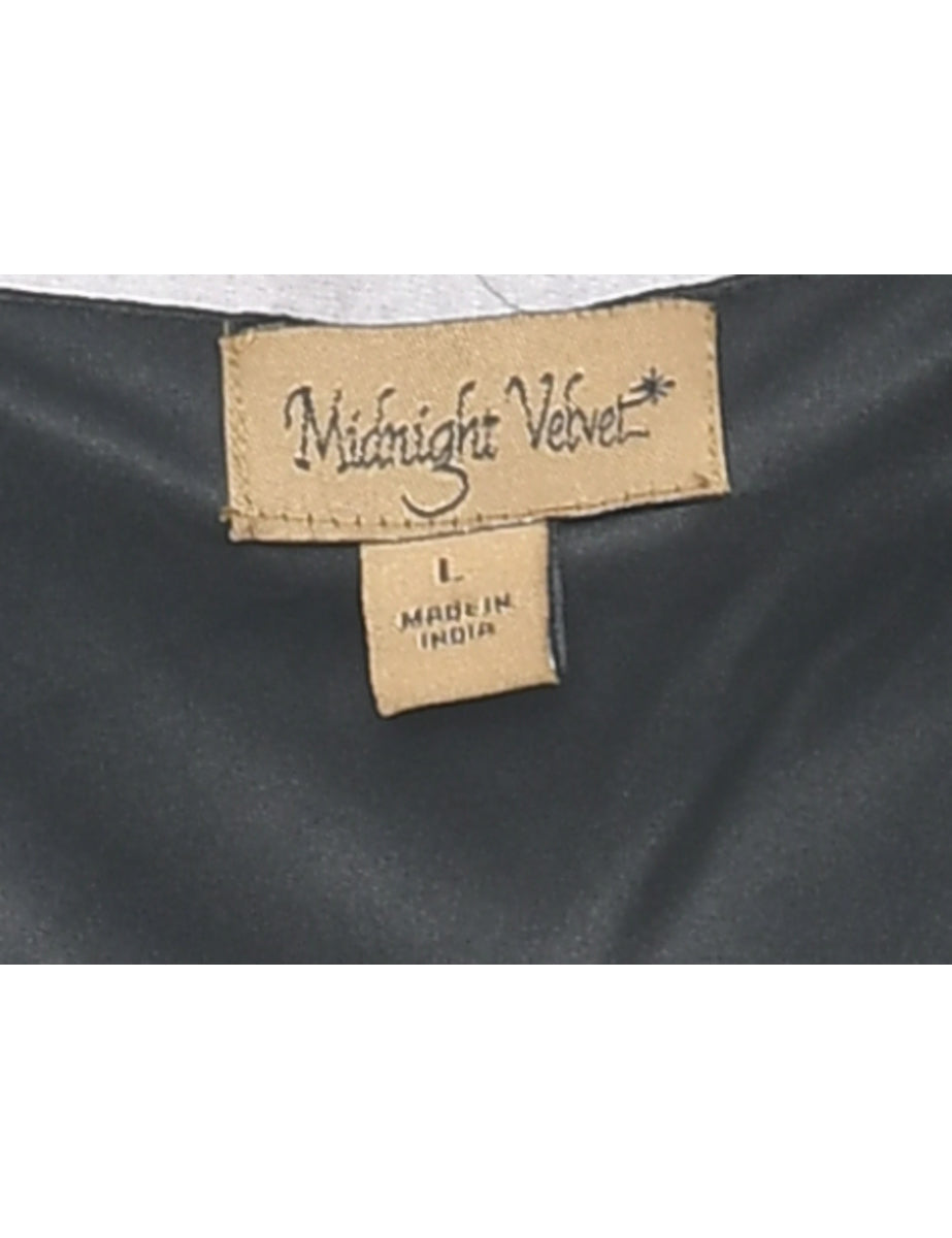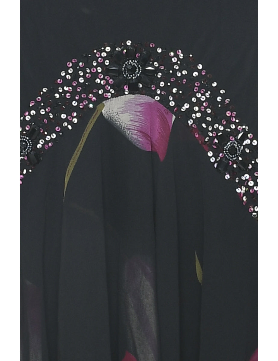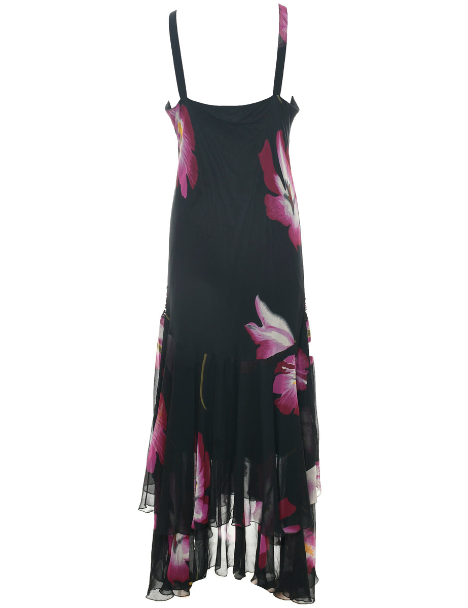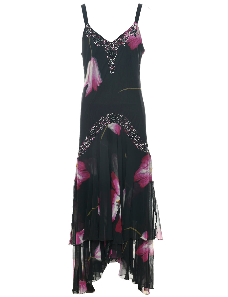 Floral print evening dress in black. The size label mentions L but based on the actual measurements we consider it a size M.