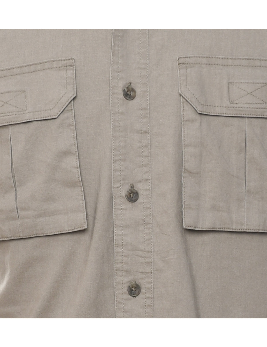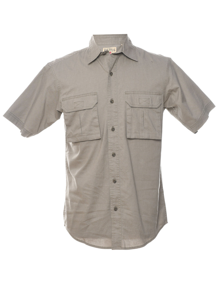 Short sleeve checked shirt in beige with a classic collar and pockets.
