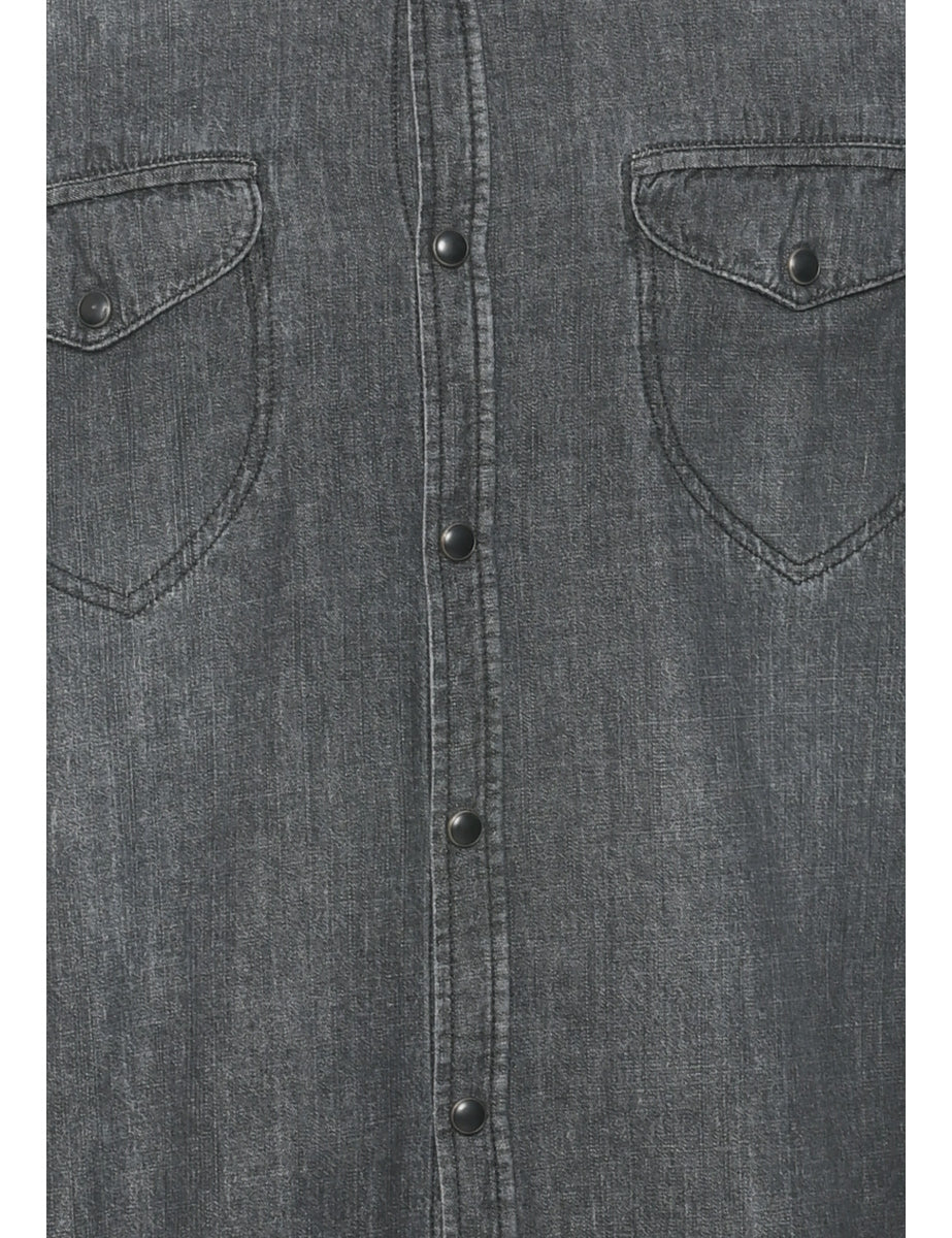 Long sleeved dark grey denim shirt with a classic collar and pockets.