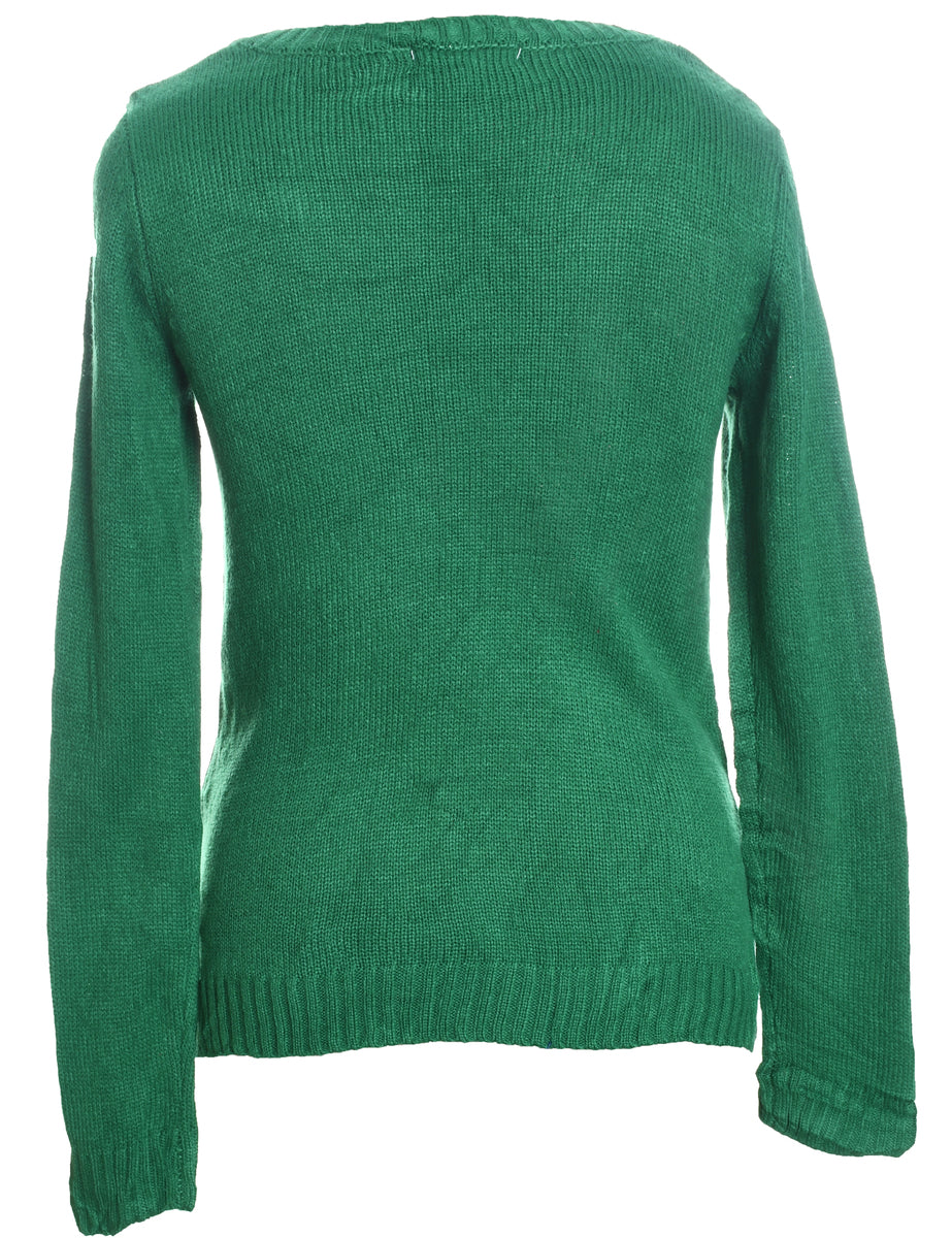 Santa claus christmas jumper in green with a round neck and pom poms.